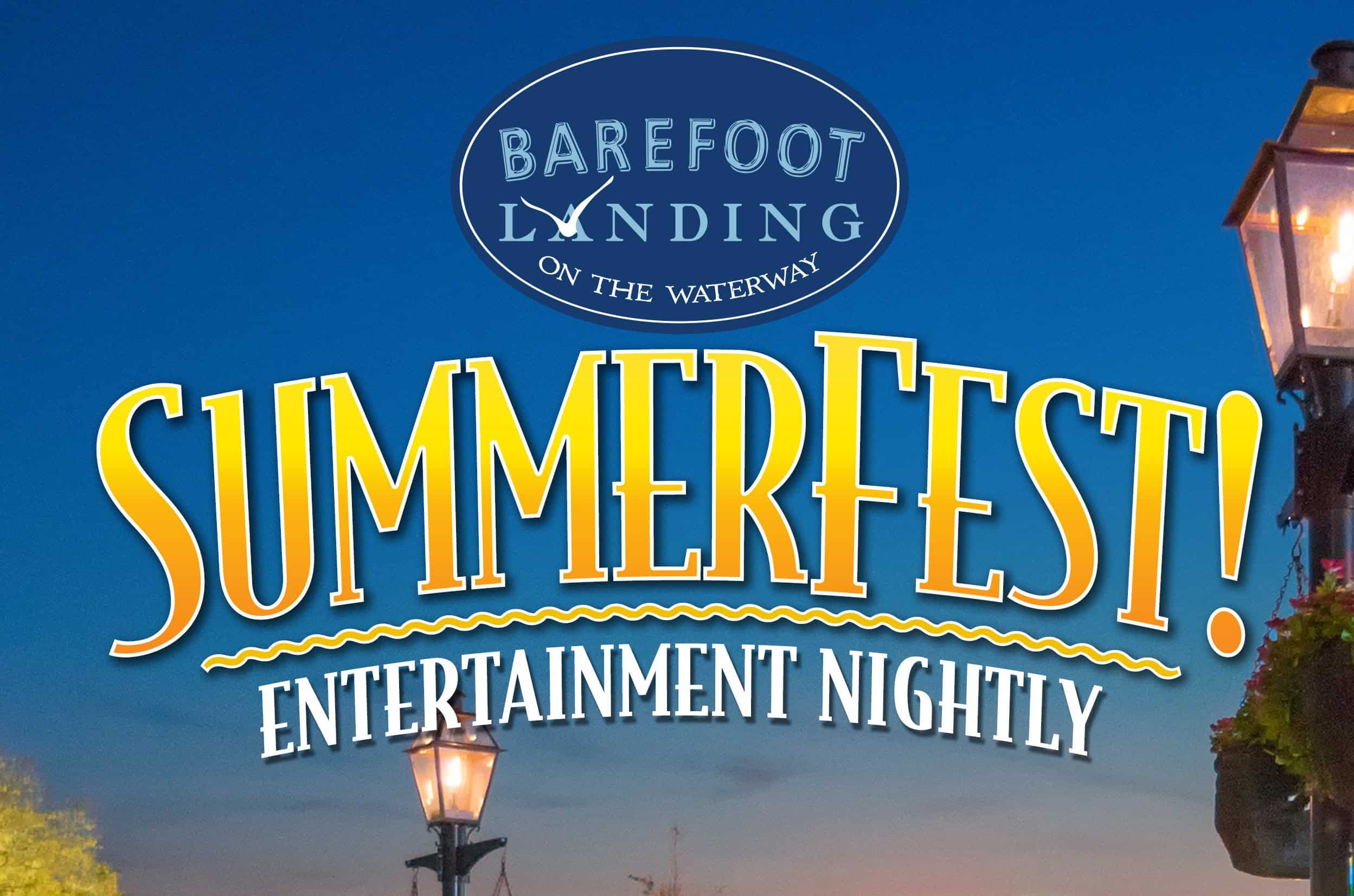 Join Barefoot Landing for SummerFest! - June 8th through August 31st! Enjoy nightly entertainment that features, live music, character appearances, costumed stilt walkers, steel drummers, weekly fireworks and more! See Nightly SummerFest! Schedule HERE *Entertainment and fireworks are weather permitting.
